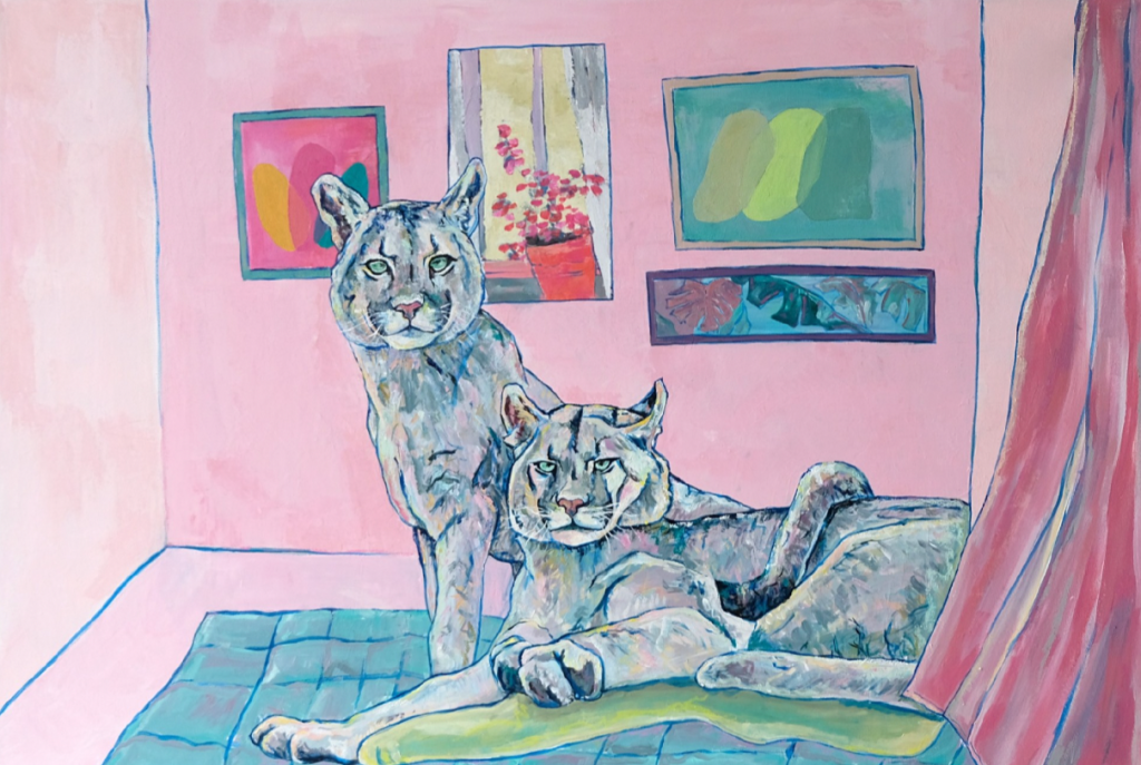 Pumas in the Room, 2024, mixed media on canvas, 36 x 24 x 1.5″, $1,000