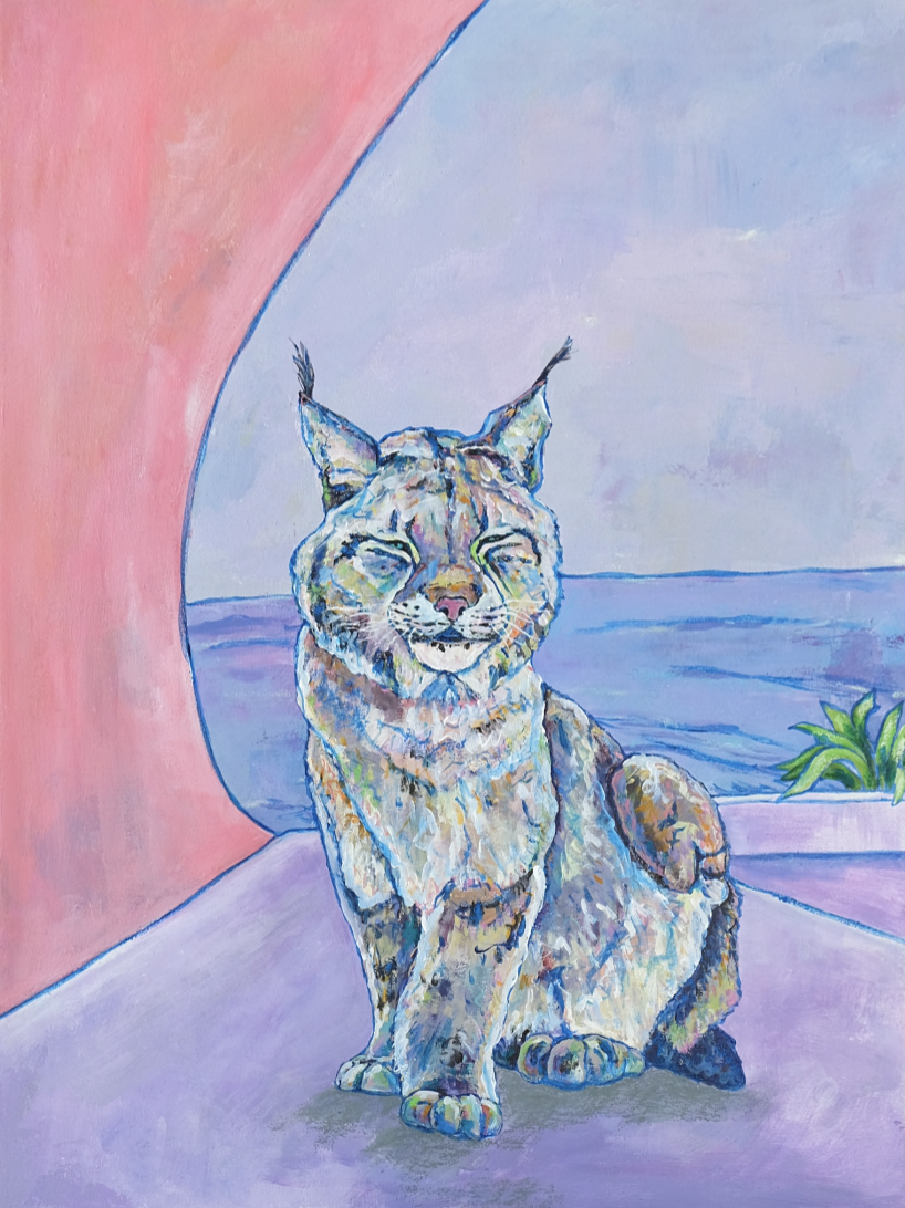Lynx on the Pink Balcony, 2024, mixed media on canvas, 18 x 24 x 1.5″, $700