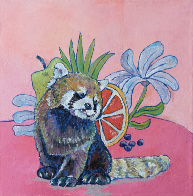 Red Panda’s Fruitful Forest, 2024, mixed media on canvas, 8 x 8 x 1.5″, $400
