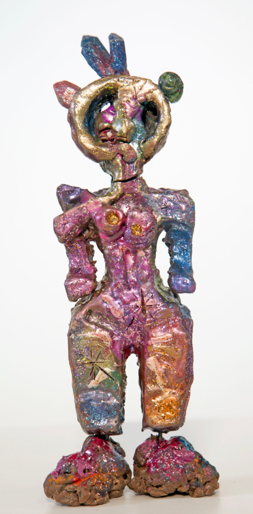 Simone Scigousky, Female Figure #1, 2021, beeswax, coffee grounds, metallic pigment, glitter, resin, and nails, $1,500