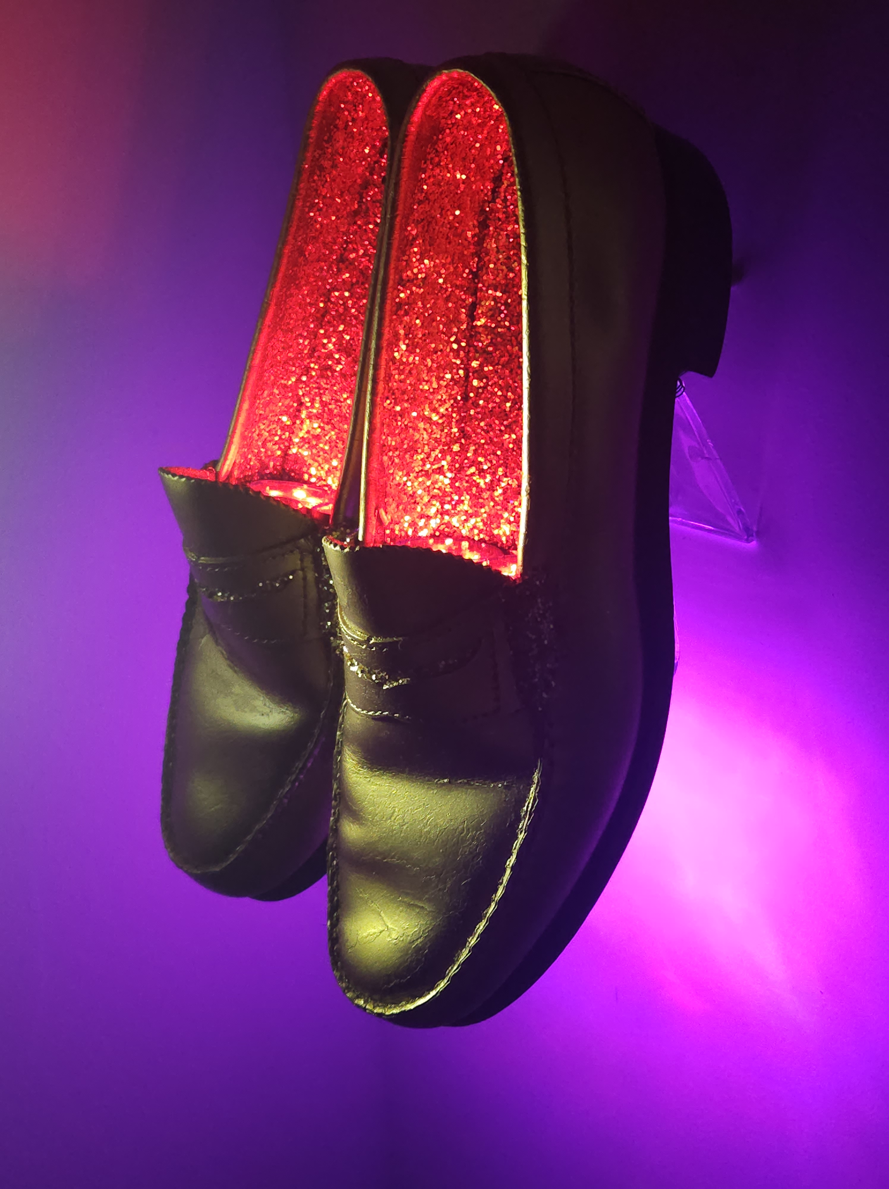 Michael Gallagher, Light In His Loafers #2: Gay and Gray Series, 2023, shoes, LED lights, gold paint, glitter, acrylic mount. H 11” x W 8.5” x D 4,” $400