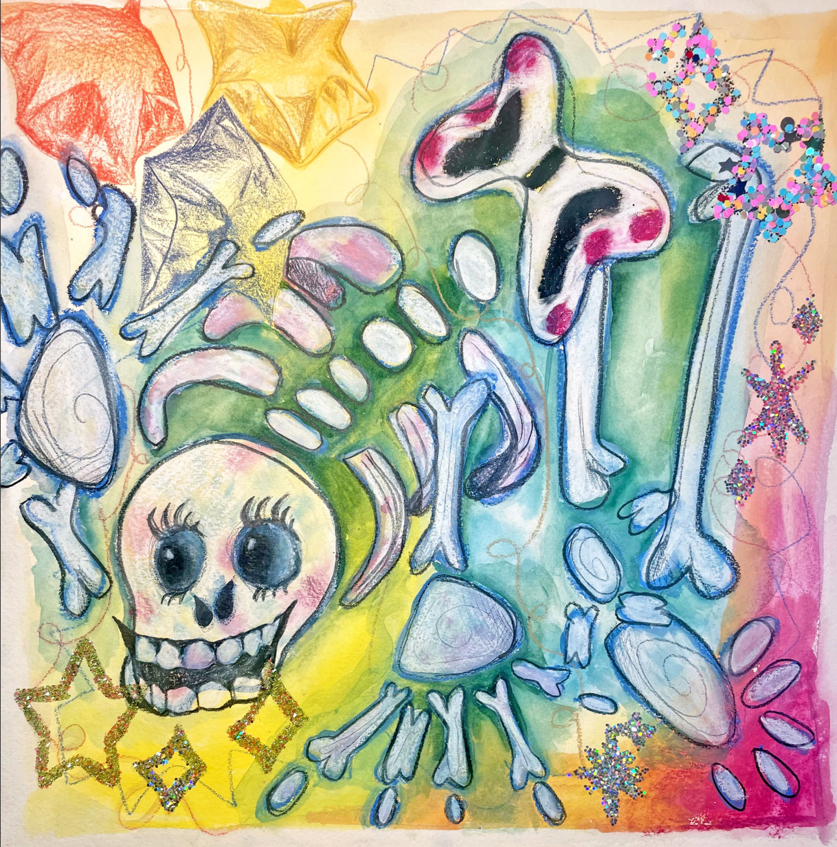 Simone Scigousky, Party Bones, 2023, colored pencil, watercolor, tempera cakes, glitter, and crayon on paper, $1,500