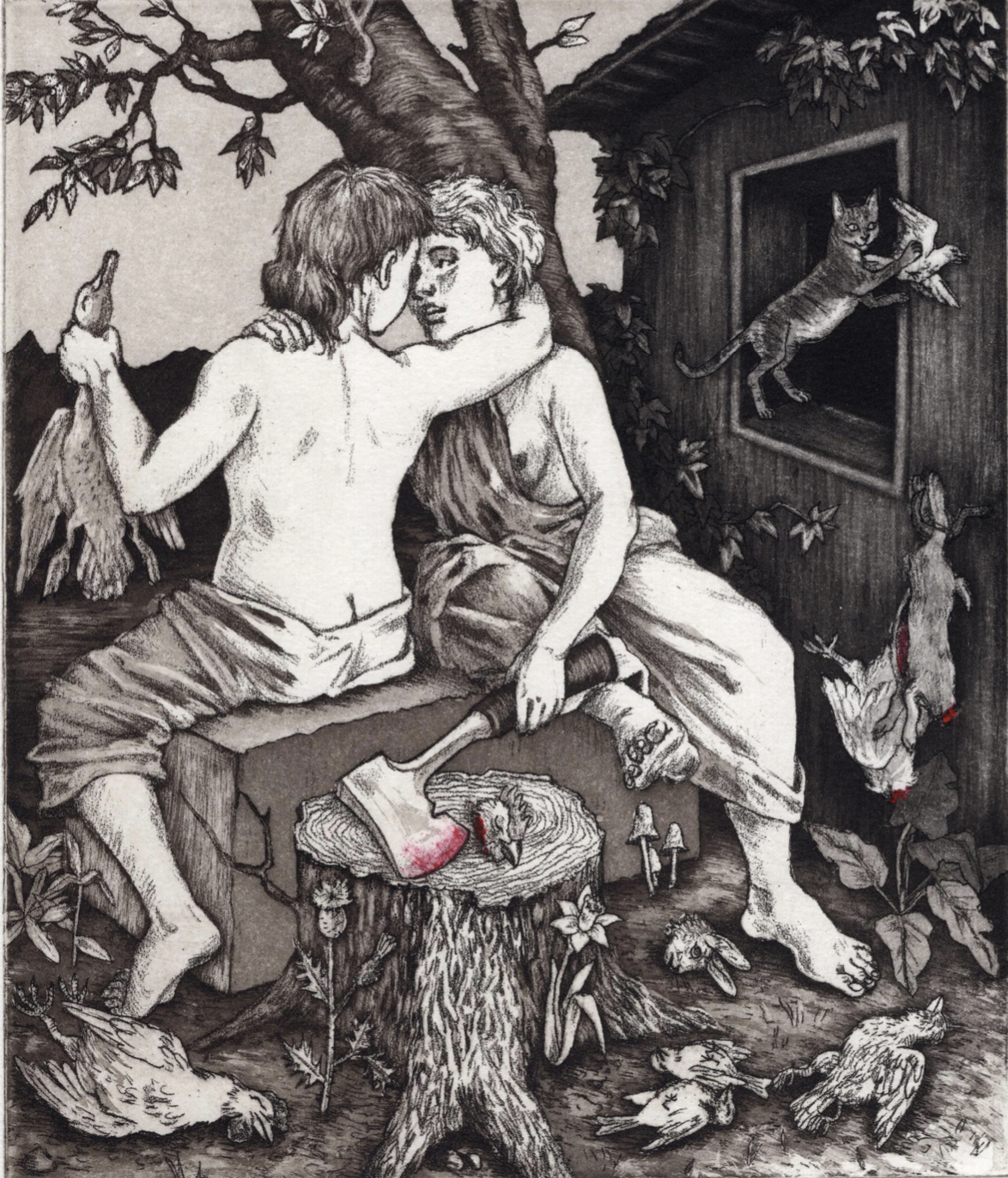 Anna Wagner, White Meat, softground etching, rosin aquatint, and engraving on copper image size, 8”x9,” printed on a sheet of 11” x 15” Hahnemule copperplate paper, $125